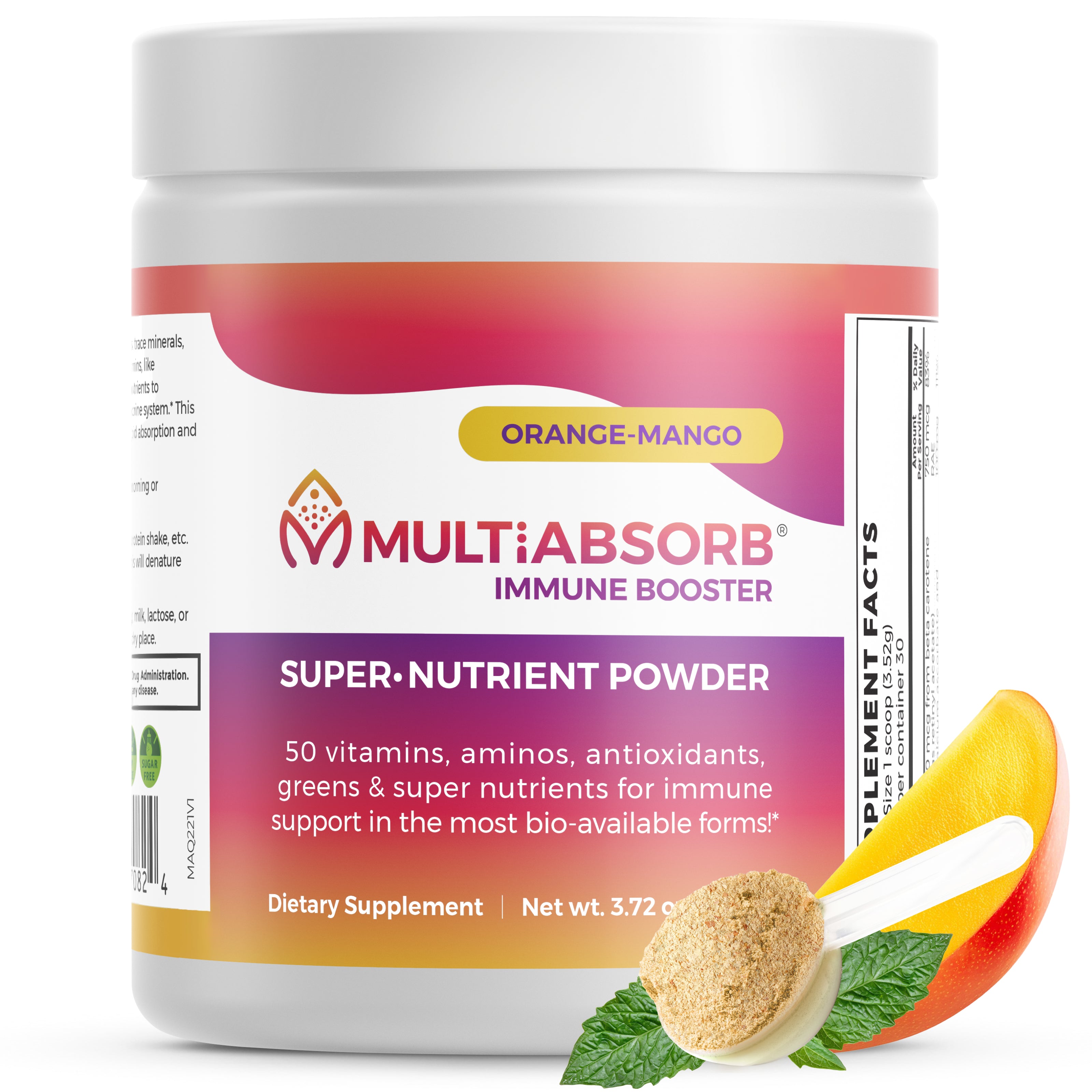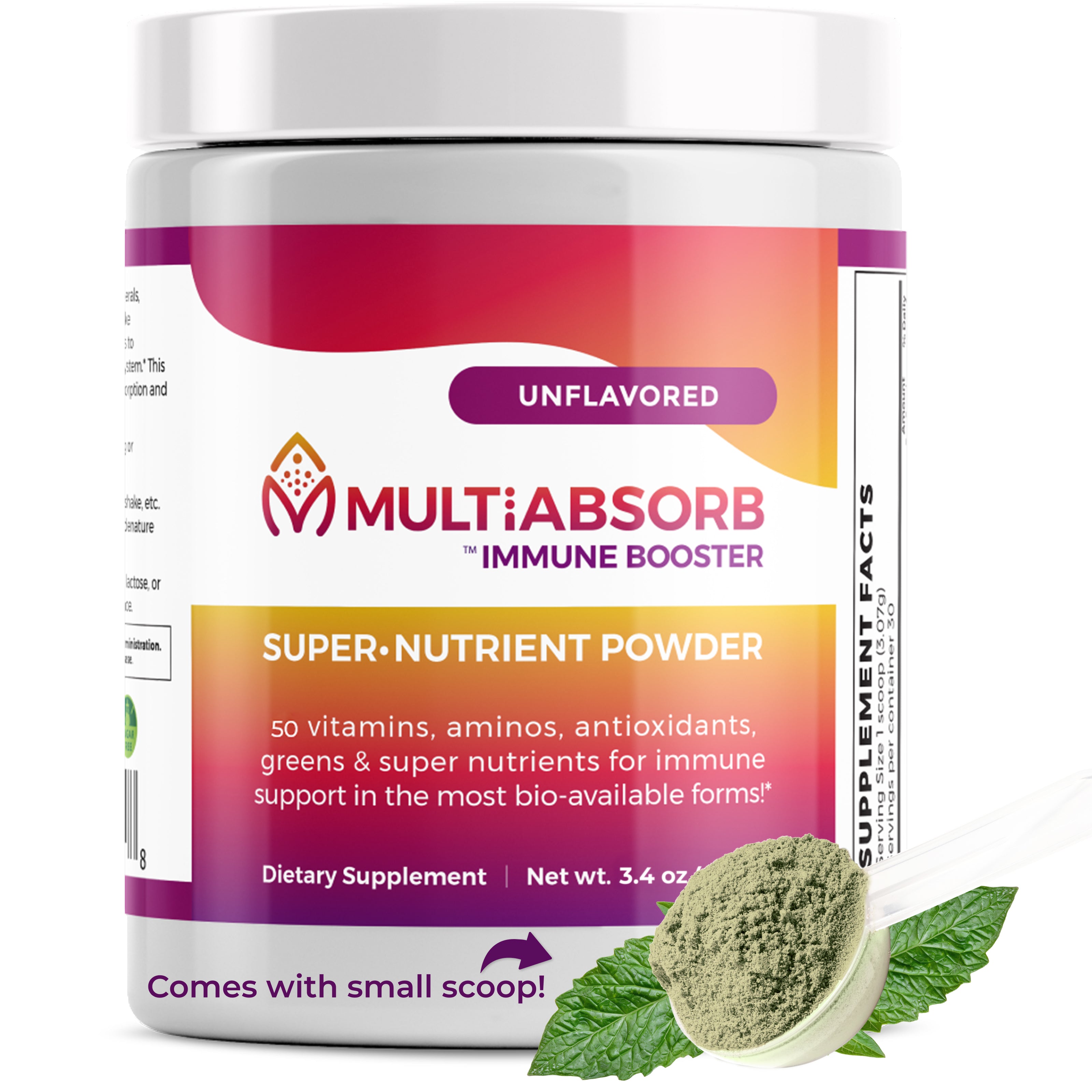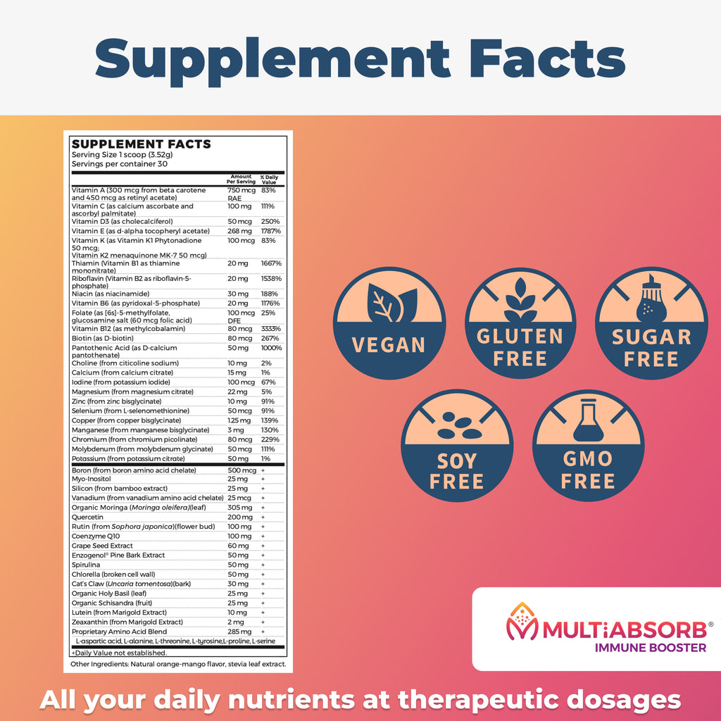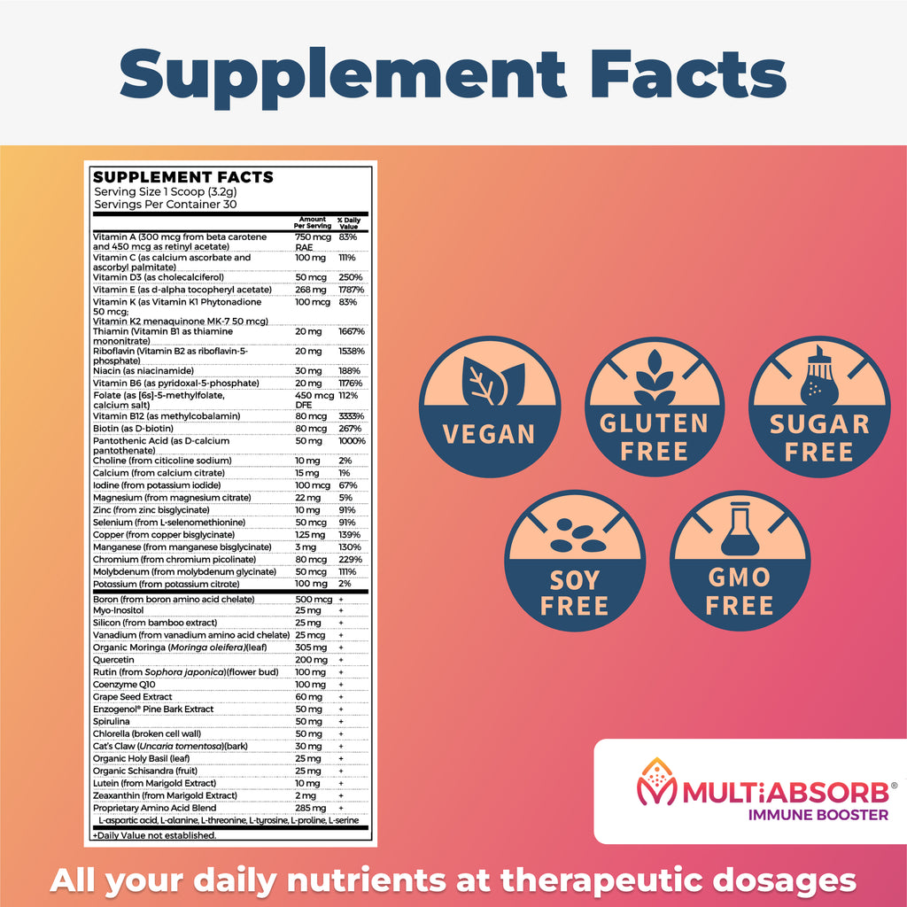 MultiAbsorb Immune Booster is a multi-vitamin + immune support in powder form – where every nutrient is ready to scoop and mix in the liquid of your choice. No fillers, flow agents, preservatives, or artificial anything! Add a scoop into water, juice, your protein or veggie shake or smoothie, just shake/blend and go!