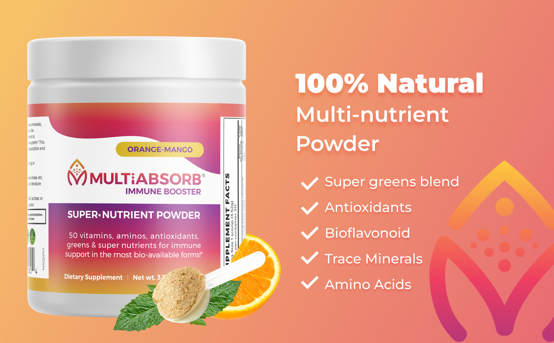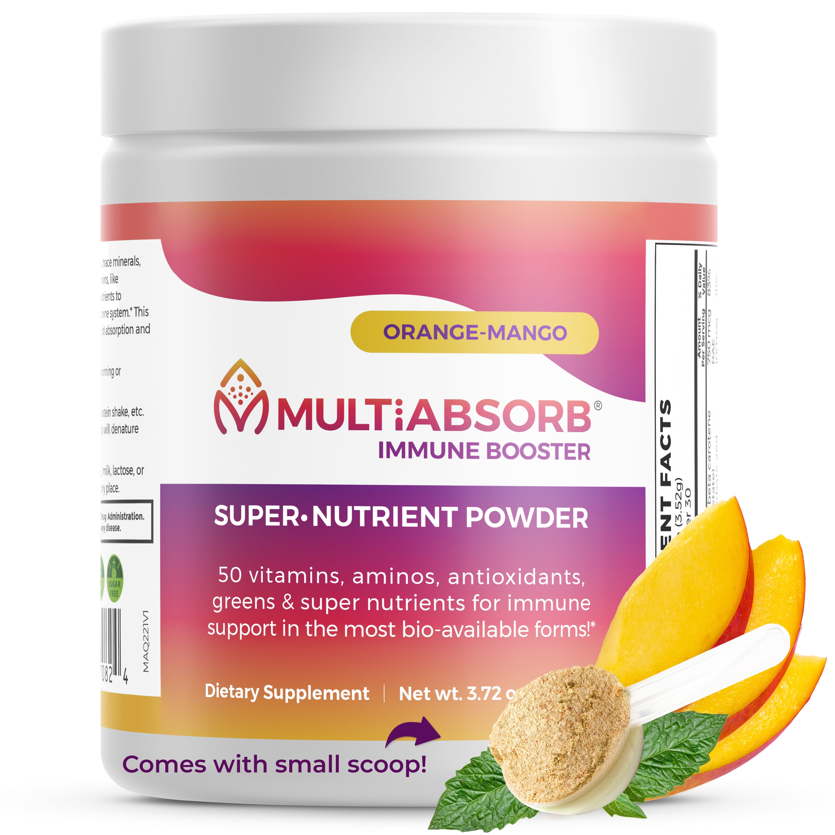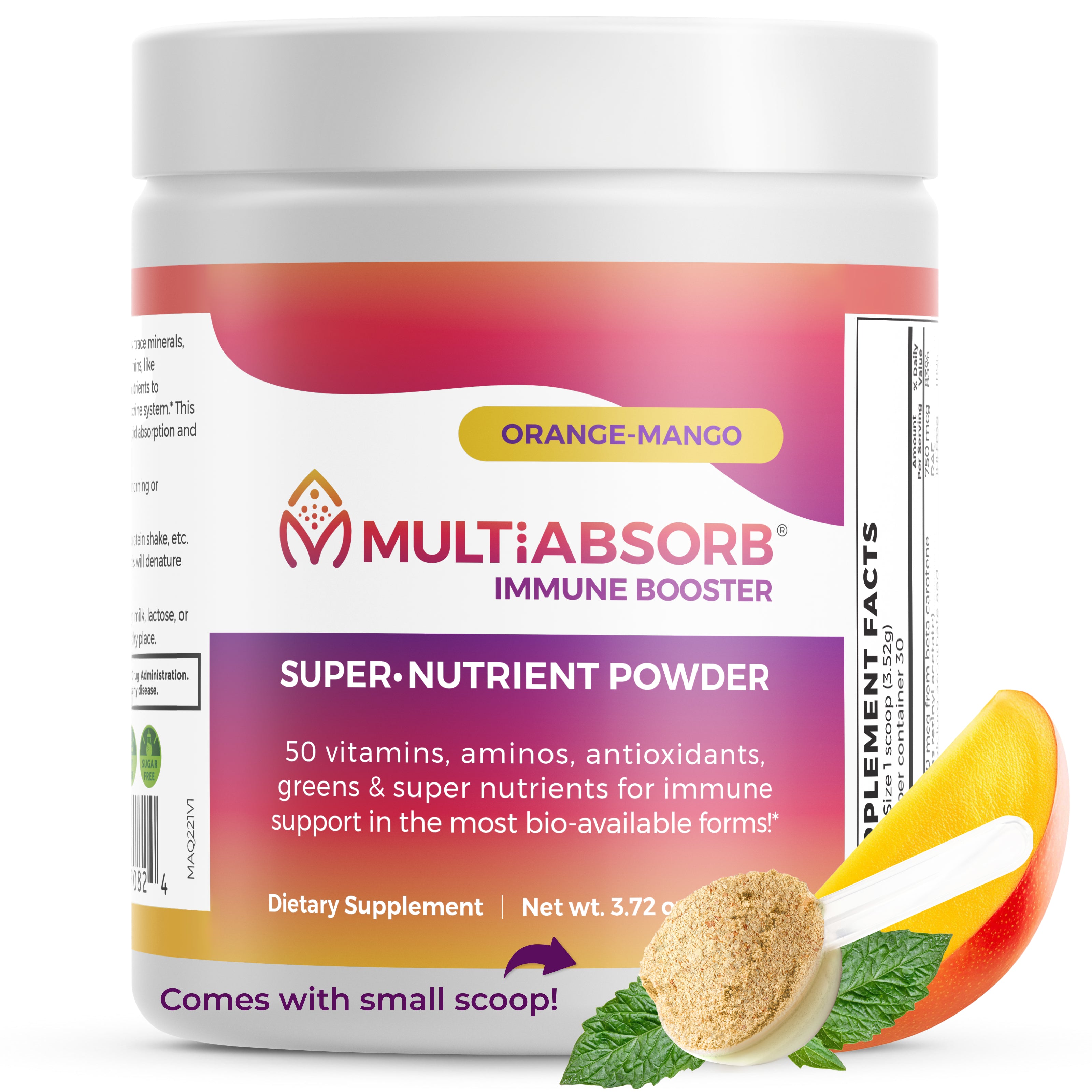 MultiAbsorb Immune Booster is a multi-vitamin + immune support in powder form – where every nutrient is ready to scoop and mix in the liquid of your choice. No fillers, flow agents, preservatives, or artificial anything! Add a scoop into water, juice, your protein or veggie shake or smoothie, just shake/blend and go!