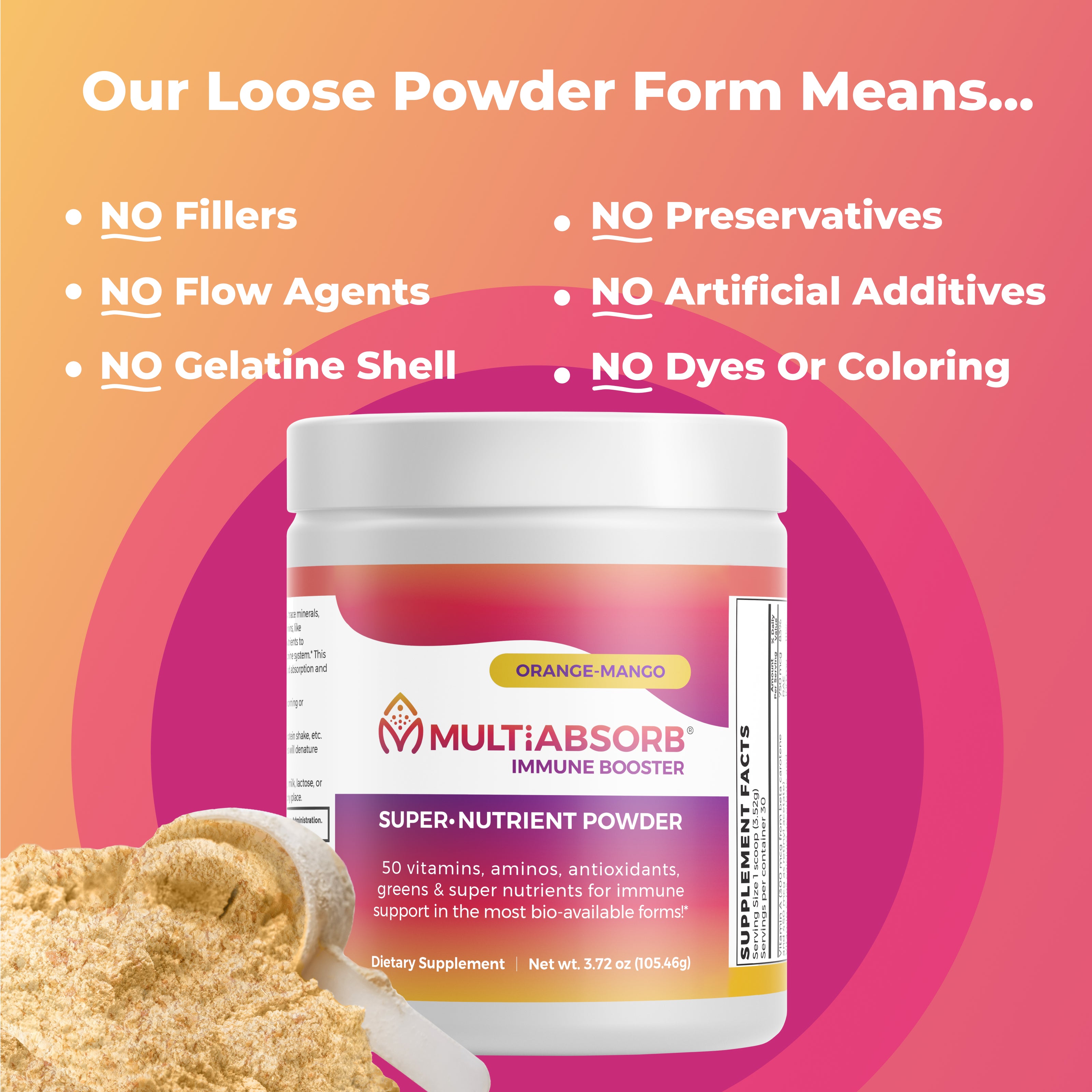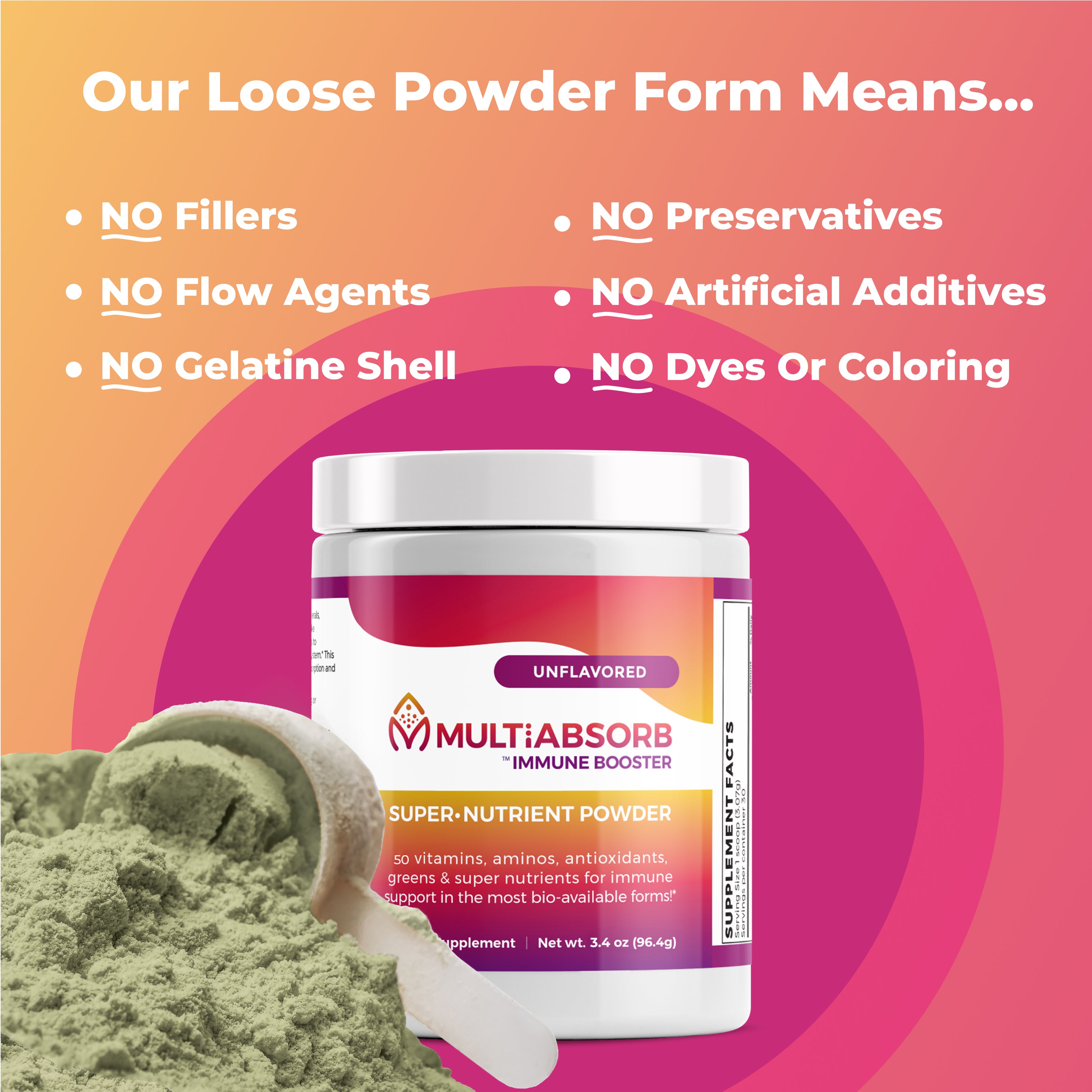 MultiAbsorb in loose powder form means NO fillers, flow agents, preservatives, or artificial anything!
