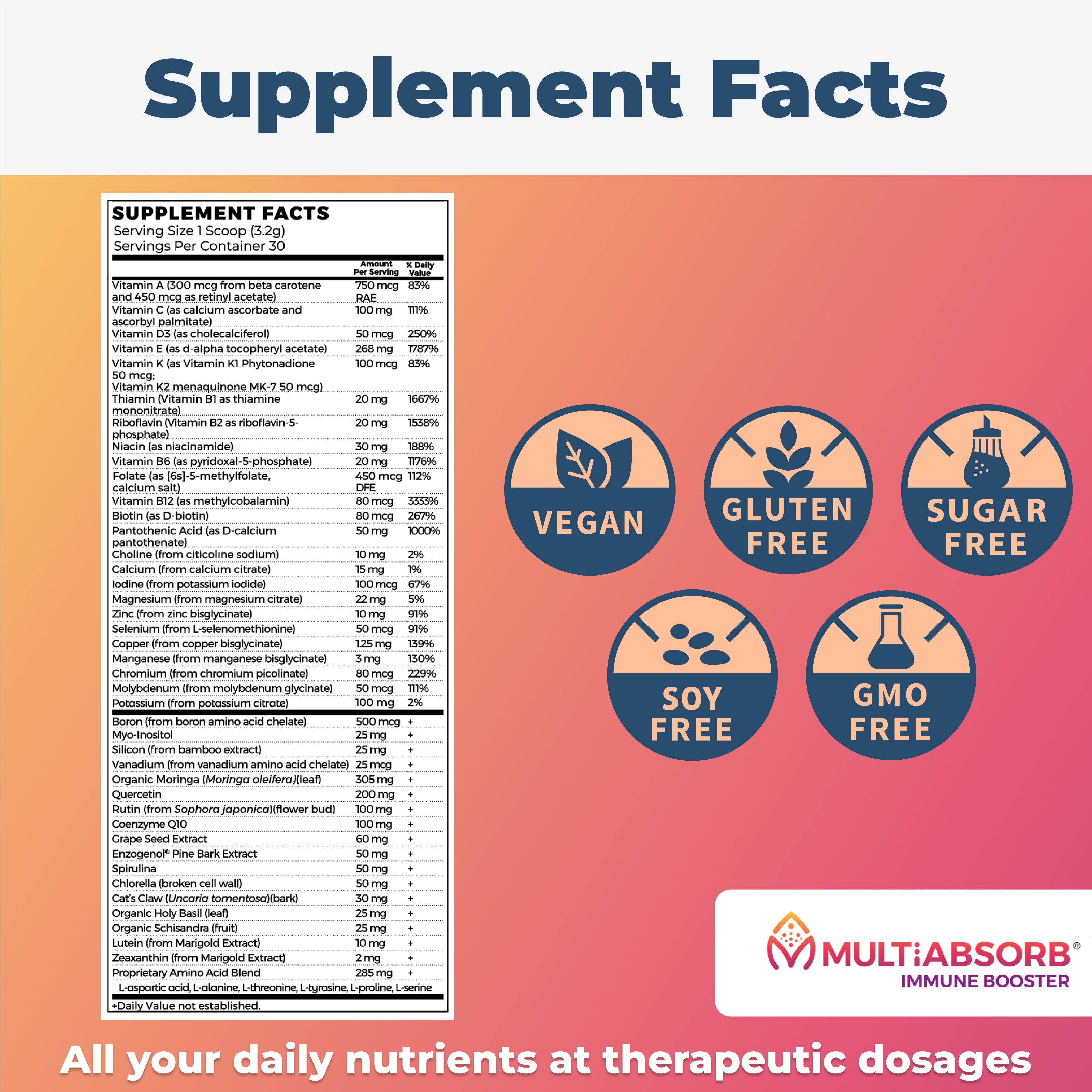 MultiAbsorb Immune Booster contains all the vitamins, minerals, trace minerals and amino acids that are in MultiAbsorb Daily Essential, PLUS targeted supplements for eye health (Lutein and Zeaxanthin) that you usually have to purchase as a separate supplement, along with the best bioflavonoids to help prevent allergies and hemorrhoids (Quercetin and Rutin), powerful antioxidants to boost nitric oxide (CoQ10, Grape seed extract, Pine bark extract, Spirulina, Chlorella, Moringa, Cat's Claw), along with 9 powerful multi-tasking herbs that support the immune system, liver, endocrine, gut, and respiratory health.